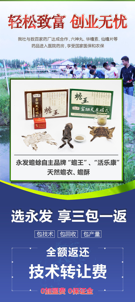 想要从事蟾蜍养殖行业的朋友,您可以与我们永发蟾蜍加盟合作,我们提供全套的技术服务和生产器具制作使用方法。我们与您签订合作协议,保障您生产蟾蜍制品的销路,后期药材出售给我们后,加盟费用我们还会全额返还。