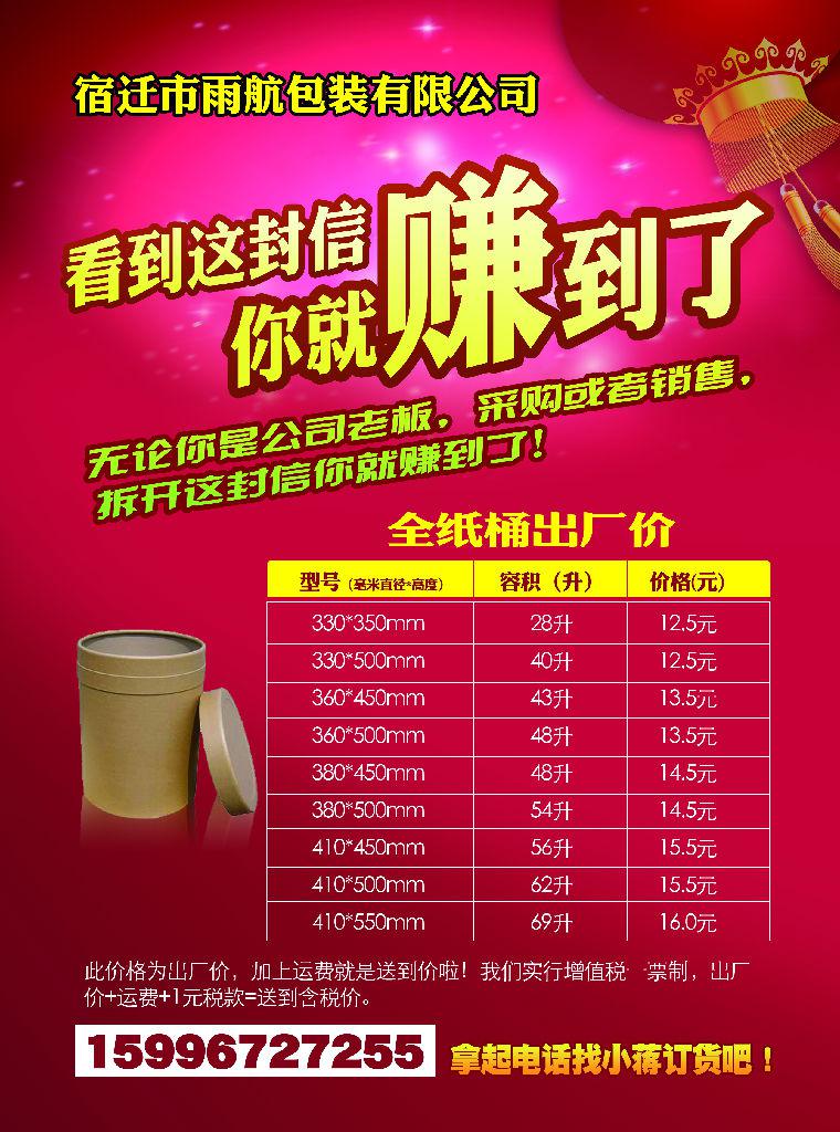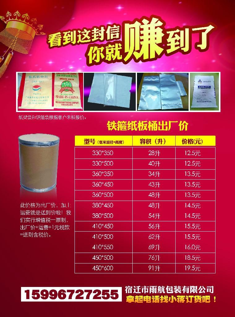 公司推荐:宿迁市雨航包装有限公司位于江苏省宿迁市宿城区南外环,紧邻S49新扬高速,地理位置优越,交通方便纸桶公司常年致力于纸桶,纸板桶,化工桶,全纸桶,木桶的出产和销售,依靠数十年的工作内摸爬滚打,聚集了丰富的出产经验,产品种类格式全,功德过硬,为企业的出口产品供给合格的出口包装,产品普遍地实用于化工、医药、燃料助剂、食品增加剂等物品的包装纸桶年出产力气三十五万只纸桶