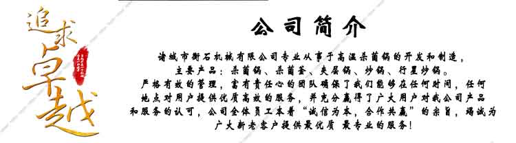 诸城市衡石机械科技有限公司座落在风景秀丽的山东半岛诸城市,专业从事于高温杀菌锅的开发和制造,主要产品:杀菌锅、杀菌釜、夹层锅、炒锅、行星炒锅。严格有效的管理,富有责任心的团队确保了我们能够在任何时间,任何地点对用户提供优质高效的服务,并充分赢得了广大用户对我公司产品和服务的认可,公司全体员工本着“诚信为本,合作共赢”的宗旨,竭诚为广大新老客户提供优质 专业的服务!
