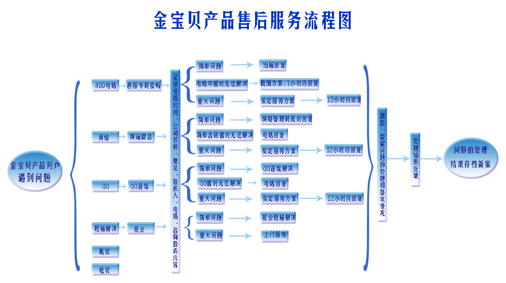 公司建立无忧售后服务体系,如免费服务热线400电话、网站网络体系、QQ在线客服、还有现场解决体系。我们会尽我们的最大努力,来尽快解决客户所提出的问题,确保客户能顺利的使用金宝贝产品。