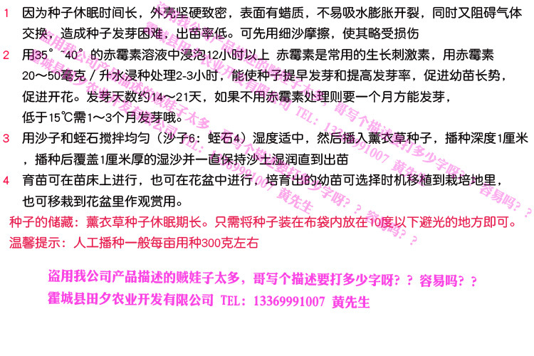 因薰衣草种子的发芽率及成活率受环境、土壤、水分、氧气等多种因素影响,这个道理地球人都知道,所以我公司概不承诺发芽率,一般承诺发芽率100%的都是在坑爹,在这就不点名说某些不良商家啦