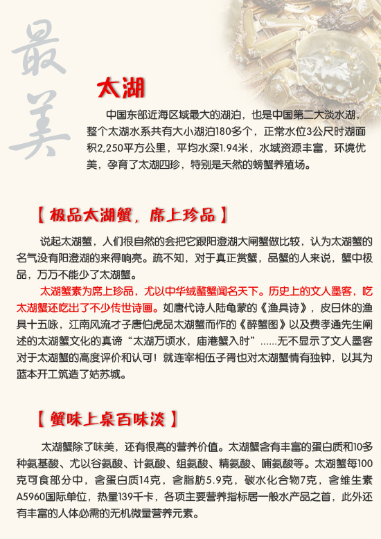 | 剪掉太湖蟹的八只脚,包 括两只大钳,放凉后其中 的肉会自动与蟹壳分开 | 将蟹掩去掉,顺势揭开蟹 盖 | 先吃蟹盖部分,用小勺把 中间的蟹胃部分舀出,轻 轻将外面包裹着的蟹黄吮 干净 |