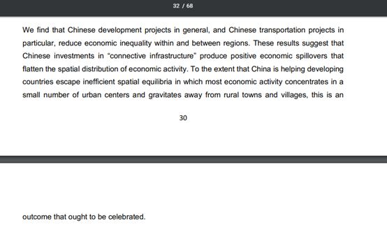 用报告的原话说就是:“我们发现中国的发展项目,尤其是中国的交通项目,正在缩减所在国家和地区的经济不平等……中国所投资的互通互联的基础设施建设,正在带来积极的经济效益,令经济活动在空间上的分配变得更加均匀。可以说,中国正在帮助发展中国家走出经济活动过于集中在少数城市中心、令乡镇和村庄失去发展机会的局面,中国带来的这一改变应该得到肯定和称赞”。