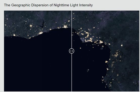 这就是这个调查的有趣之处了,研究人员是通过美国国家海洋和大气管理局的卫星,对这些中国项目的所在地[夜里开灯的情况]进行观测的——说得再通俗点就是,如果一个地方夜里电灯亮起的比较多,那么这个地方经济活动比较频繁。